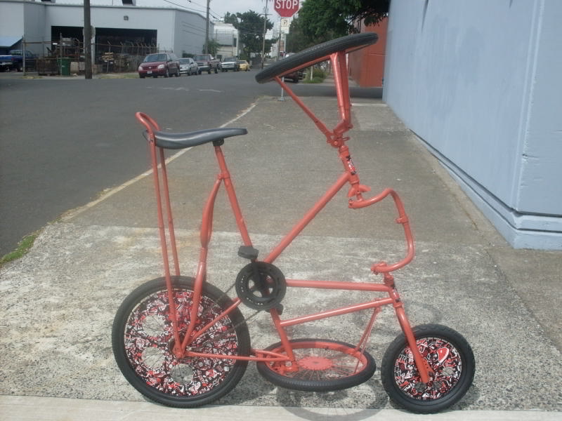 seats that are already adjusted to fit me,maybe you do too !!! I discovered that when measuring from the center of the bottom bracket to the hole in the seat where the sissy bar attaches, all of them came out to 29" !!!!! I also found out a way to do this with regular seats,just measure from the center of the bottom bracket to the bottom of your seat post clamp on your seat. Mine always came out to 24 1/2",see what I'm sayin' !!!!! These measurements are VERY important because you want to be comfortble riding the finished bike,with proper leg extension. So adjust your seat accordingly.STEP TWO-Now step back and look at the bike from the side. Does the back of the seat go past the center of the rear wheel ??? UH-OH !!!!!! Rule of thumb for ALL tallbike builds-ALWAYS MAKE SURE THE BACK OF THE SEAT IS AT OR IN FRONT OF THE CENTER OF THE REAR WHEEL !!!!!! If you don't address this problem while building,the finished bike will have a strong tendancy to tip over backwards,NOT GOOD !!! You wanna make a bike that is well balanced and a JOY to ride,NOT a barely rideable MONSTROSITY !!!!!!!!!!!! Some banana seats might be too long to use,this is why for this bike I am using a shorty seat from a kids 16" bike. STEP THREE- Remove your seat but leave the seat post, Find a pipe or chunk of frame tubing that fits over the seat post. Now while straddling the front of the bike,grab the pipe with both hands and gently pull it towards you.Make sure you pull it nice and straight !!!!!! Do this a little at a time,put your seat back on periodically to see where it is in relation to the center of the wheel. Once you have it in the right place move on to the next step. STEP FOUR-The sissy bar will be made from 3 pieces of 3/4" scrap electrical conduit,2 pieces of 3" long straight h-bar tubing,and 2 pieces of 4" long h-bar tubing.The handlebar tubing is used to strengthen the parts of the bar where the bolts are attached and to connect the 3 main pieces. Now measure from the rear axle to the sissy bar mounting hole in the seat. Add 1" to that figure.This will be your overall length for your side pieces. Cut 2 lengths of conduit to this size. Now take the 3" pieces of h-bar tubing ( the PINK chunks in the pictures ),cover the insides w/silicone and slide them over one end of each piece of conduit until they are flush. Now using a 1/4" drillbit drill holes near the top of the h-bar pieces and install bolts as shown. Next,measure 1 1/2" from the bottom and make a mark there. Using a hammer,flatten the tubing up to that mark. Next measure 3/4" from the bottom of the flat sections,make a mark there. Now ,using a 3/8" drillbit,drill holes at that mark.This is the bottom of your side pieces and will (for now ) be attached to the rear axle. STEP FIVE-Moving to the top of the side pieces,measure and mark at 2" AND 4". Cut the conduit off at the 2" mark. Now take the 4" pieces of h-bar tubing,coat the insides w/silicone,and slide them onto the conduit up tp the remaining mark. Now drill 1/4" holes near the bottom end of the h-bar pieces and attach bolts. STEP SIX- Now measure 1/4" down from the top and drill 1/4" holes making sure they are in line with the 3/8" holes on the other end. Install the completed side pieces,find some bolts that are long enough to attach the seat to these pieces. STEP SEVEN- Measure to see how high you want the sissy bar to be ABOVE the seat.Double that measurement and find a piece of conduit that length. Now bend that piece evenly in half. If you have access to a tubing bender,use that,if not just fold that puppy in half!!!! STEP EIGHT-Remove the bolts from the seat,put some silicone on the ends of your top piece,and slide both ends down into your side pieces. Using the existing holes as a guide,drill 1/4" holes through to the seat holes and re-attach the seat bolts.You may notice from the pictures that I redrilled the sissy bar mounting holes further back on the seat. This is to make is to make sure the back of yer BUTT is mostly resting on the seat NOT jammed up against the sissy bar !! Dat's VERY UNCOMFORTABLE !!!!! STEP NINE- You will now have to bend the top part of the sissy bar back at an angle. Grab the back of the seat and the top of the bar and slowly bend it back to the angle you want. Alrighty then,tighten everything down and yer DONE !!!! Check out that COOL LOOKIN' sissy bar you just made !!!!! I really dig the look of this style of sissy bar. It kinda looks like the type the Bay Area chopper builders were puttin' on there motorcycles back in the days when Sonny Barger was still a young feller !!!! Those were and still are some of the coolest things on wheels !!!!! Ed Roth did some great drawings of these bikes. I've got a little tip that might be helpful about adjusting banana seats. Yer butt rests in the lowest part of the dip in the seat. Understand what I'm sayin'!!!!! Adjust the nose of the seat up to move yer butt back,or adjust it down to move yer butt forward. If you adjust it too far down in the front you'll keep sliding towards the front while riding. That's REALLY uncomfortable AND annoying,just experiment with different adjustments until you find the right one for you. The first 2 photos in this post are of what the bike looked like after the steps in this part were finished. I removed all the paint ( READY TO RUST !!!!!!!!! ), put an extra bend in the sissy bar,AND put a longer upside down fork on the top frame.When building vehicles like this it is always best to make changes,or fix potential problems as you are building rather than afterward.Okay that's it for now,PART D will deal with making the backbone that ties the 2 frames together at the rear. Any questions,comments,critcisms ( positive or negative ) E-mail me at omahgarsh@gmail.com I'd love to hear what you have to say !!!!!!!!